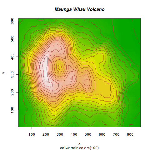 # Maunga Whau Volcano Example # Copyright (c) //R Development Core Team [5]// x <- 10*(1:nrow(volcano)); x.at <- seq(100, 800, by=100) y <- 10*(1:ncol(volcano)); y.at <- seq(100, 600, by=100) # Using Terrain Colors image(x, y, volcano, col=terrain.colors(100),axes=FALSE) contour(x, y, volcano, levels=seq(90, 200, by=5), add=TRUE, col="brown") axis(1, at=x.at) axis(2, at=y.at) box() title(main="Maunga Whau Volcano", sub = "col=terrain.colors(100)", font.main=4)